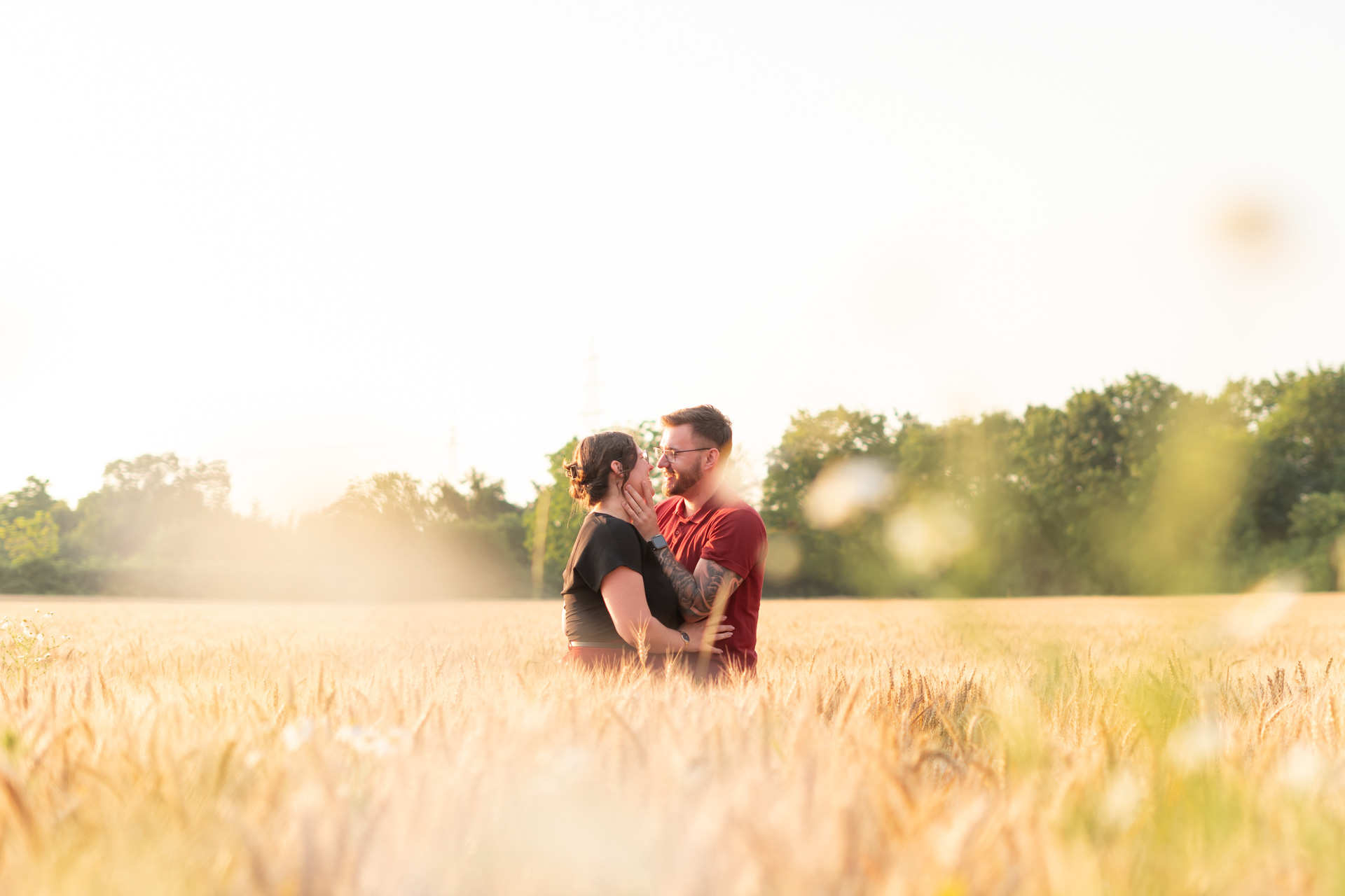 Braut und Bräutigam stehen Stirn an Stirn auf einem Feld beim Sonnenuntergang – Hochzeitsfotograf in Offenburg Jonathan Gäßler hält diesen emotionalen Moment fest.